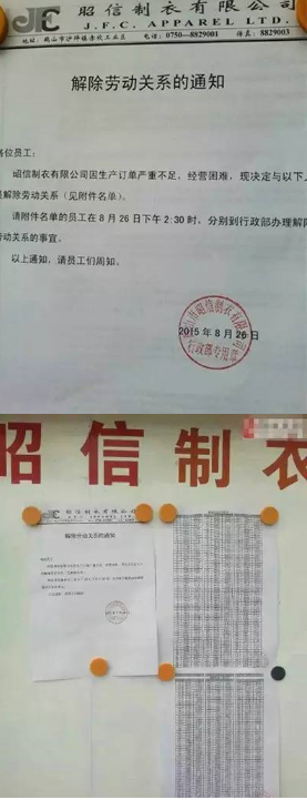 8月26日,广东省江门市鹤山赤坎昭信制衣厂一则“解除劳动关系的通知”在业内引发强烈轰动。《通知》称,“昭信制衣有限公司因生产订单严重不足,经营困难,现决定与以下人员解除劳动关系。”