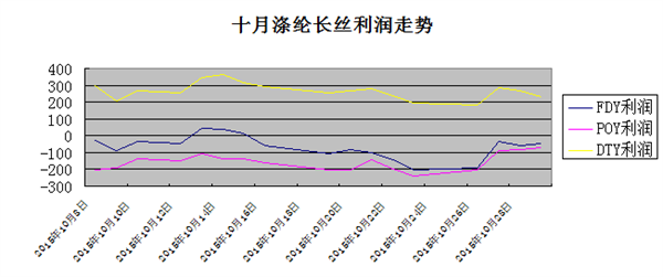直纺POY(预取向丝),POY=0.86×PTA+0.34×MEG+900元/吨,由此计算得出POY生产成本在6656元/吨附近;而月底国内市场主流厂家POY 150D平均报价大约在6550元/吨附近,较上月价格相比略有拉涨,上涨了大约200元/吨。虽然十月份POY产品价格重心略有上移,但是仍难改其亏损的局面,目前来看POY生产厂家仍有近百元的亏损幅度。
