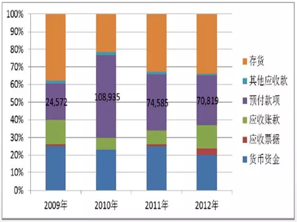 当然如果分析的细致一点,流动资产周转率也不容小觑。可以看到A公司应收账款是所占比例较小,但预付账款的比例却很大。A公司采购棉花多以预付方式,由于年末预付账款余额较大,占用大量营运资金,导致公司经营活动产生的现金流量净额为负,因此在2010年A公司需要大量资金支持,短期负债迅速拉伸,造成后期财务费用居高不下。(见下图)