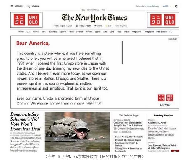 向来自信的 CEO 柳井正有点坐不住了。今年 8 月,他花重金在《纽约时报》纸质版刊登整版广告,同时买下了这份报纸网站版首页最上方、位置最醒目的广告位,写了一封 " 给美国的信 "。这样的做法并不符合优衣库以往在美国的低调作风。