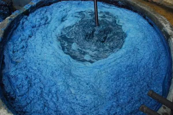 蓝染使用的植物叫做蓼蓝,制做染料过程大体上无异:把蓼蓝的叶子放在染缸中发酵,浸泡时间根据温度有一些不同,之后将腐叶捞出,与碱(通常就是石灰乳)、糖混合快速搅拌,搅拌时间视泡沫高耸的情形而定,当泡沫下降减少,而呈现细小状时,即可停止,并让蓝液静置,待蓝靛沉淀后,便可将上层的咖啡色废液排出,或用胚布袋过滤,即可取得蓝靛。