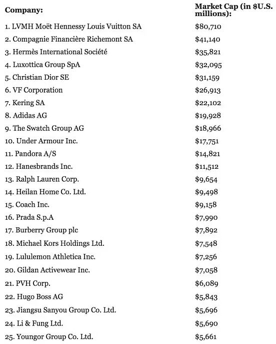 令人意外的是,前 25 强中出现了不少中国面孔。总部位于江苏江阴的海澜之家以 94.98 亿美元的市值排在第 14 名,处在 Ralph Lauren 和 Coach 之间。同样位于江苏的服装生厂商江苏三友集团也跻身排行榜;在香港交易所上市利丰有限公司(Li & Fung)紧随其后,位列第 24 名;榜单的最后一名雅戈尔集团也来自中国。1979 年以服装起家的这家宁波公司如今市值达到 56.61 亿美元。