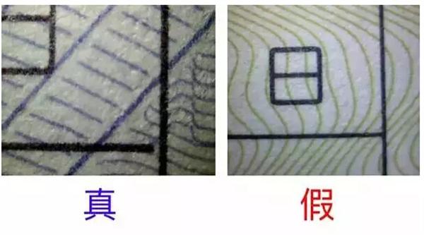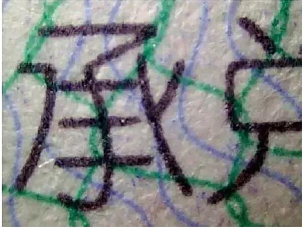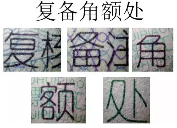 在票据的正背面,有如下图所示的五个字:“复”、“备”、“角”、“额”、“处”。与正常打印出的字体明显不同。除了“角”字以外,其他4个字都是字体中的“反文旁”该出头时不出头。