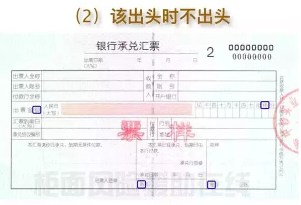 在银行承兑汇票的下方,有“承兑日期 年 月 日”,在后面的“日”字外部的右下角,两条边框线的交汇处,是断开的,这一点,不用放大镜的情况下,也可以看得很明显。