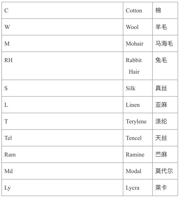 正规企业生产的纺织品,均按国家规定统一编号。在成品服装的衣领处或内侧的小牌上常用英文符号或中文标注此服装的所用面料,如下所示:
