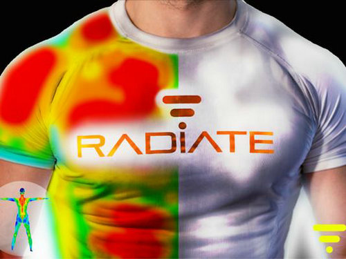 Radiate智能运动T恤通过感知人体散发的热量来获取运动者的肌肉锻炼情况。Radiate穿戴者在运动的过程中血液流动和新陈代谢加快,会让人体产生较大的热量,Radiate监测人体热量的变化,并通过颜色变化反映给运动者。Radiate采用新科技纤维缝制,散热吸汗穿着舒适,弹力和耐用度也很高。