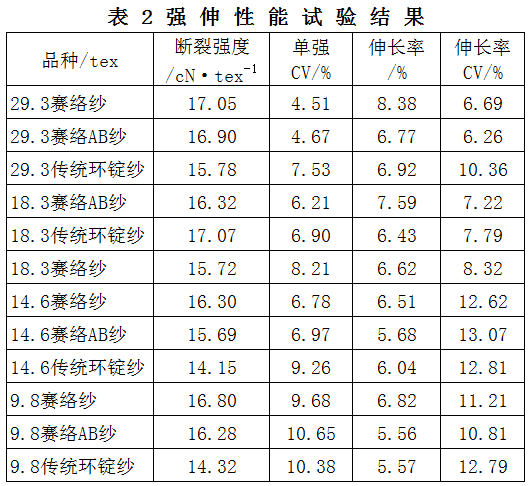 由表2可知,所纺赛络纱、赛络AB纱的断裂强度均明显高于传统环锭纱;赛络纱与赛络AB纱两者相比,除18.3tex纱外,赛络纱均稍高于赛络AB纱;赛络纱的伸长率大于赛络AB纱和传统环锭纱,传统环锭纱伸长率稍大于赛络AB纱;传统环锭纱伸长率CV明显高于两种赛络纱,说明赛络纺工艺对改善成纱强力不匀有较好的作用。