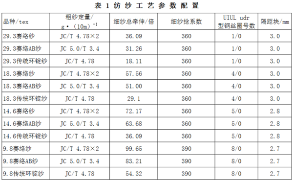 赛络AB混纺纱所用的一根精梳棉粗纱定量为5.0g/10m,另一根涤纶粗纱定量为3.4g/10m,在细纱工序进行混纺;普通赛络纺方式采用两根相同的JC/T60/40混纺粗纱,定量为4.78g/10m,进行纺纱;环锭纺纺纱方式选用JC/T60/40混纺粗纱,定量为4.78g/10m,进行纺纱。