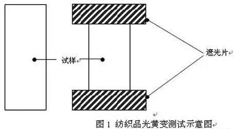 本单位在纺织品的光黄变测试上进行了一定的研究。所采用的方法与纺织品耐光色牢度的测试方法基本类似,仅使用的光源不同。基本测试原理是将一块长方形纺织品用遮光片遮住头尾部分,然后置于专用的试验箱内,在一定温湿度下,用太阳灯管或紫外线灯管对纺织品进行规定时间的照射,并观测试样光照部位颜色的变化情况,按GB250灰色样卡评定样品的变色程度,从而判定纺织品耐光黄变的能力。测试示意图如图1所示。