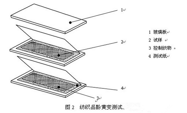 按照Caurtauldsmethod和ISO105-X18:2007,酚黄变测试的试验装置与常用的耐汗渍色牢度的测试仪器基本一致。将被测试样与一块用于控制时间的织物分别用含有苯酚的测试纸包裹之后夹在玻璃板之间,形成组合试样,施加一定压力后用聚乙烯薄膜裹紧置于规定温度的烘箱中,一段时间后移出,冷却后拆开聚乙烯薄膜,取出控制织物和试样立即用GB251灰色样卡评定试样的沾色等级。如果控制织物的沾色达到预定值,则试样的沾色级别即为测试值,否则重新进行试验,测试示意图如图2所示。