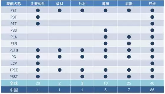 可以合成的新聚酯有:PEN、PBN、PETN、LCP。制成材料主要特点:优秀的阻隔性能、较高的模量。应用在:工业丝、瓶、薄膜。