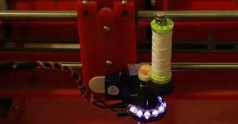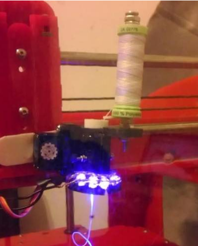 这台原型机是这样工作的:他在打印机挤出头那里装了一根棉线,然后把棉线的一段泡在UV光敏树脂里。浸透了光敏树脂的棉线不断从打印头挤出到构件平台上,然后用LED的紫外线灯对其进行照射,使其瞬间固化。