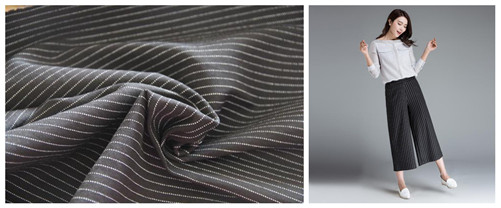 如果说,你已经被豹纹迷彩印花面料震得两眼“晕眩”,不妨再来看看他们新研发的“阔腿裤”面料。阔腿裤风潮可以说吹遍了今年的时装圈,每个女孩子基本上都会至少购买一条阔腿裤。因此,作为专业生产高档女装面料的雅顿纺织,自然早就嗅到了“阔腿裤”面料的强大商机,今年,他们就强势主推了几款功能不同、花型各异的弹力裤面料,该类面料大多以“涤纶”、“粘胶”、“锦纶”或“氨纶”等为主要原料,是一种互补性较强的面料,涤纶原料能使面料看起来挺括有型且耐洗,锦纶能使面料耐磨抗皱,可穿性较强,粘胶纤维又可以改善了织物的透气性,降低了起毛起球和抗静电现象,氨纶丝又可以使面料弹力十足,手感柔软。他们根据客户需求,将几种原料不同组合,通过不同的经纬纱支、密度和变换织物组织形式织造出质量上乘的坯布,再通过其他后整理方式织造出客户满意的阔腿裤面料。