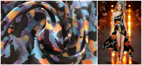 今年,他们就“玩”出了几款市场“喜闻乐见”的新面料。豹纹迷彩印花面料,轻薄透气,触感柔软与肌肤贴近,质感上也与真丝非常相似,但价格却要便宜许多。值得一提的是它的花型,采用水印花处理过的花型逼真自然,黑、黄、橘、蓝和紫等主要颜色尽收眼底,给人一种炫目但是错落有致的感觉,不乏时尚的气息。