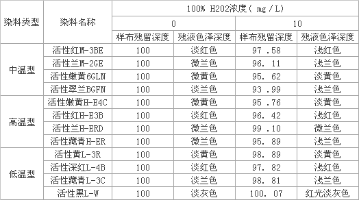 实验得知:无论是低温型或高温型活性染料,还是中温型或热固型活性染料,在含有H202的染浴中染色,其得色深度都会明显下降,仅下降幅度不同。而且,H202含量越高,下降幅度越大。各种类型的活性染料,在浸染染色中耐H202的稳定性都比较差。