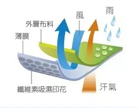 防水材料,在古老的中国有一大堆作品,油布伞是一个代表产品。但这种涂层材料没有空隙,无法直接贴身穿着。为了透气,现在的功能性防水面料在防水处理方面往往采用微孔或透湿的防水膜来阻止水分子深入,但薄膜本身过于脆弱,所以要依靠表布、薄膜、内里相互配合才能达到防暑的功能。防水能力用抗水压值来表示,即以固定面积的防水布阻挡持续上升的水压,当表面渗出第三滴水珠时即为该面料的抗水压值,通常超过1000mm就可以达到最基本的防水能力,这个数值越高越好,因为防水薄膜会随着洗涤而降低抗水压能力。在户外活动中,由于背包压迫、膝盖跪地、坐在地上滑行等等都会提高外界水压,所以超过3000mm是必要的。防水膜的种类与加工手法不同其性能有较大差别。防水透气膜不能直露在外面,所以在做成服装时要么做成三层面料,把防水膜夹在面料之间;要么做里子同样也把防水膜遮挡起来。消费者是很难看到这层膜的。