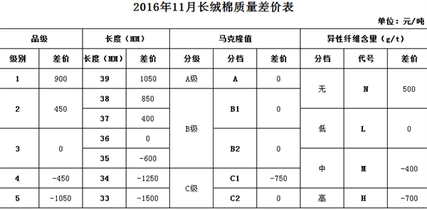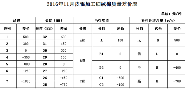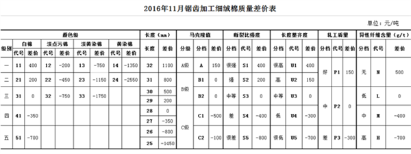 根据《中国棉花协会国产棉质量差价表管理办法》的规定,现正式发布2016年11月《锯齿加工细绒棉质量差价表》、《皮辊加工细绒棉质量差价表》和《长绒棉质量差价表》(差价单位为元/吨)。与上月相比,对本月的质量差价调整如下: