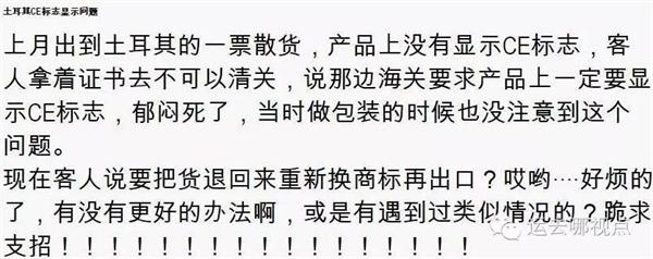 最近,又有很多外贸人中招了。网友“丑百牛奶”的经历,其出口灯具到土耳其时,客户反映柜子清关有问题,土耳其海关表示灯体产品上没有印CE标志,拒绝放柜。