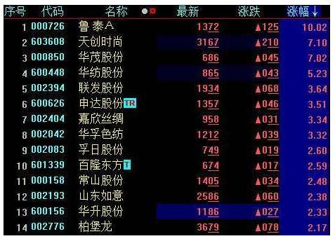 受人民币贬值影响,纺织服装板块爆发,截至发稿,鲁泰A拉升涨停,天创时尚、华茂股份涨逾7%,华纺股份涨逾5%,嘉欣丝绸、联发股份、华孚色纺等均走强。