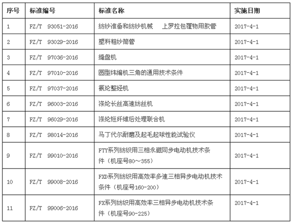 中华人民共和国工业和信息化部发布2016年第56号标准公告,批准《纺纱准备和纺纱机械 上罗拉包覆物用胶管》等605项行业标准。其中,涉及纺织机械行业标准共计11项。纺织机械领域新颁布实施行业标准简明目录见下表。