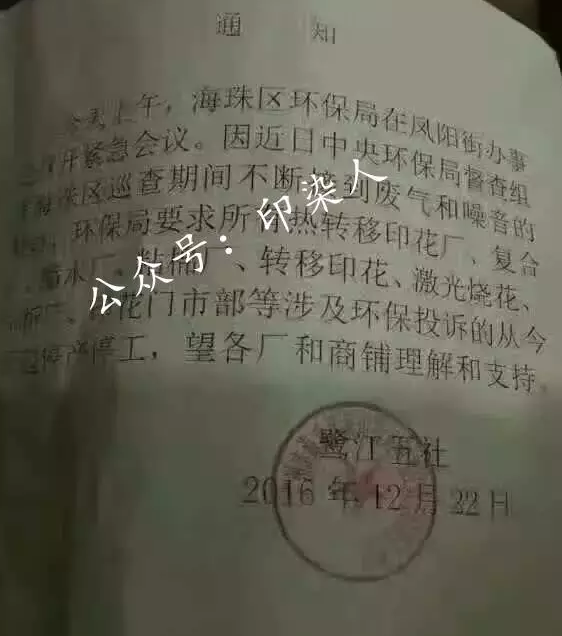 广州海珠区鹭江五社12月22号的通知,要求所有涉及印花的全部停工停产。
