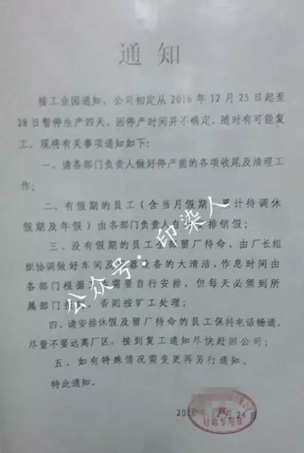 接工业园通知,公司初定从2016年12月25日起至28日暂停生产四天,因停产时间并不确定,随时有可能复工,现将有关事项通知如下。