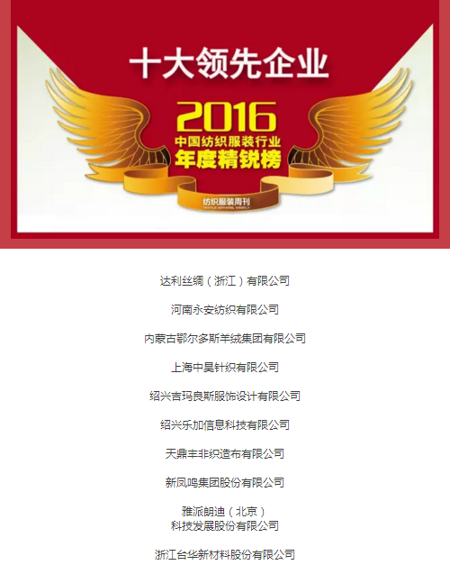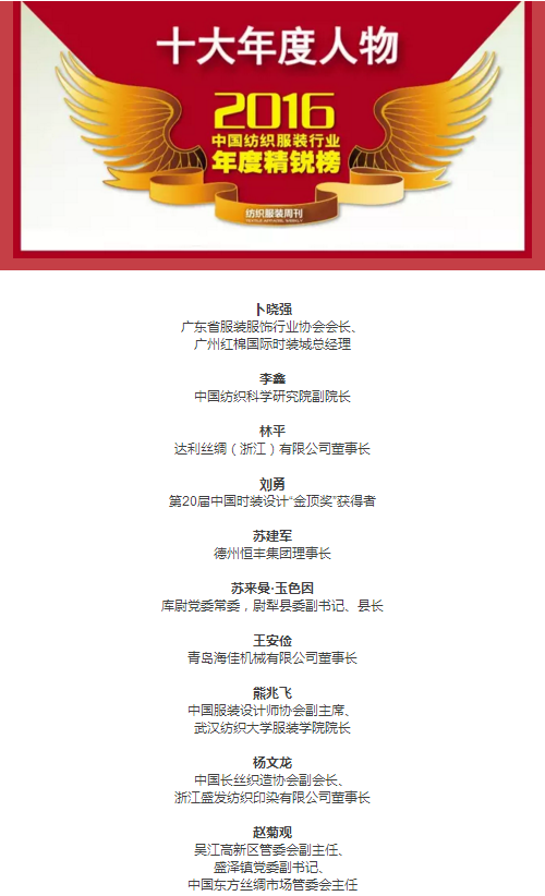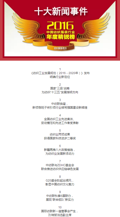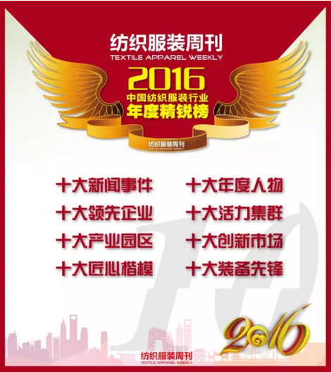 在岁末年初之际,我们继续隆重推出“中国纺织服装行业年度精锐榜”,以媒体的视角审视行业发展轨迹,精选出十大新闻事件、十大年度人物、十大领先企业、十大活力集群、十大产业园区、十大创新市场、十大匠心楷模、十大装备先锋。