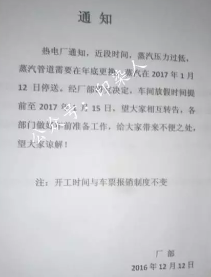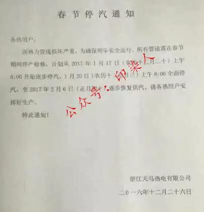 因热力管线损坏严重,为确保明年安全运行,所有管道需在春节期间停产检修,计划从2017年1月17日上午进行停汽,1月20日全面停汽,至2017年2月6日,逐步恢复供汽,请各热用户安排好生产。